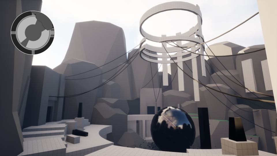 After the player leaves the central piece for the first time, the level becomes more open. A lot of verticality is presentet to the player. I use these areas with platforming as a means to control the overall pacing. I subtely guide the player through the environment with clear buffer zones of when to dash, jump or grapple. While traversing the cliffs a soft reveal of the first arena is presented to the player, this enables her to make inform decisions later on. This sections ends with a good vantage point before the combat arena. When the player decides that she's ready there's a point of no return right before the action begins.