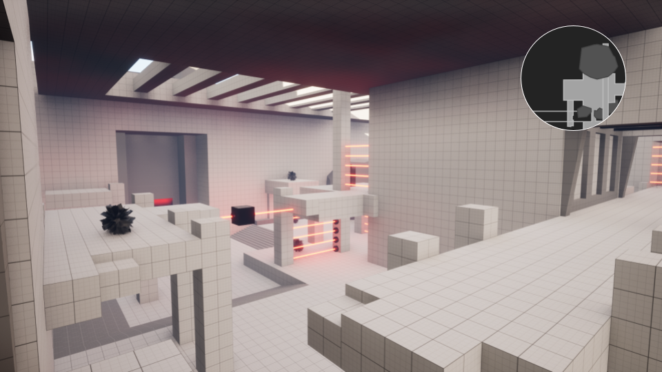 This is the most narrow out of the 4 arenas, but at the same time the one with the most verticality as it consists of 4 floors on top of eachoter that loops well together to create a fluid combat experience . The goal of the arena is to reach the top in order to progress further. At the decompression zone the player has a great opportunity of planning how to approach the arena. The sightblocker hides a good portion of the first floor but since it's not the first time the player encounters a protective pylon she understands that the first visible enemy can't be taken down without tracking the source of the protective beam first. Using the verticality of the stairs as cover against the first enemys one dimensional attack will be prove useful. I mix in environmental traps into this arena to raise the perceived complexity.